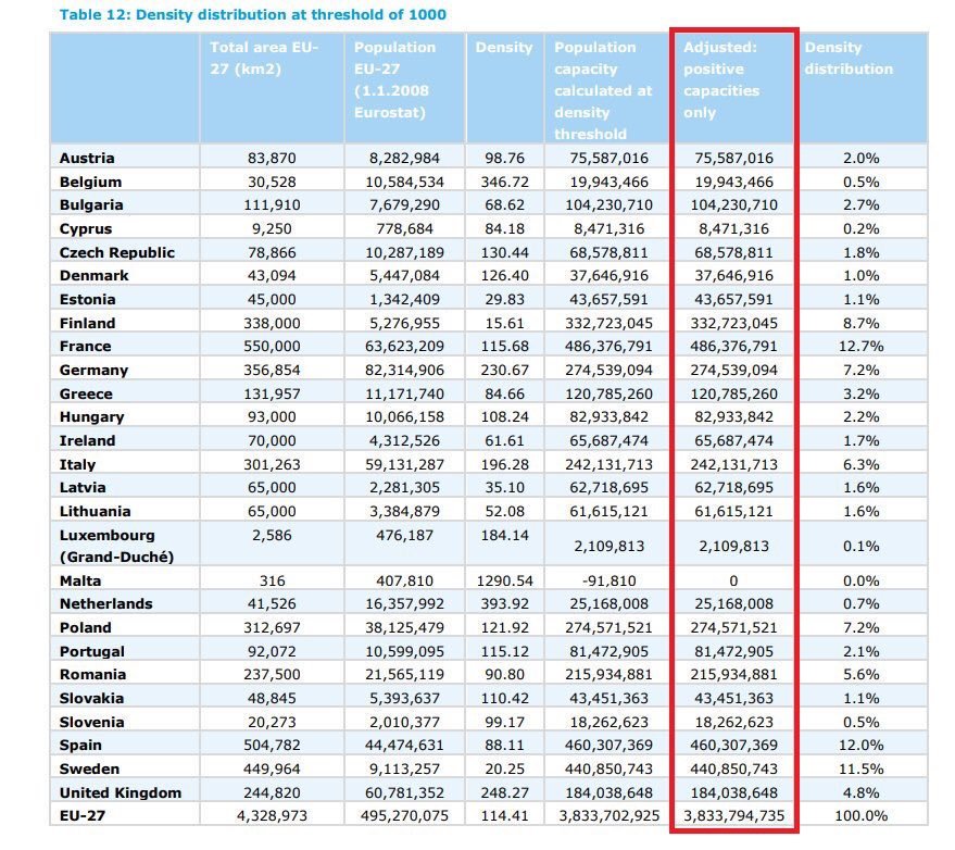 Guardate anche gli altri paesi. Alla Francia vengono assegnati 486 milioni di abitanti, alla Polonia 274 milioni di “densità” potenziale. Io spero che sia un falso, ma temo di no. E’ la Grande Sostituzione dettata e decisa in una tabella.