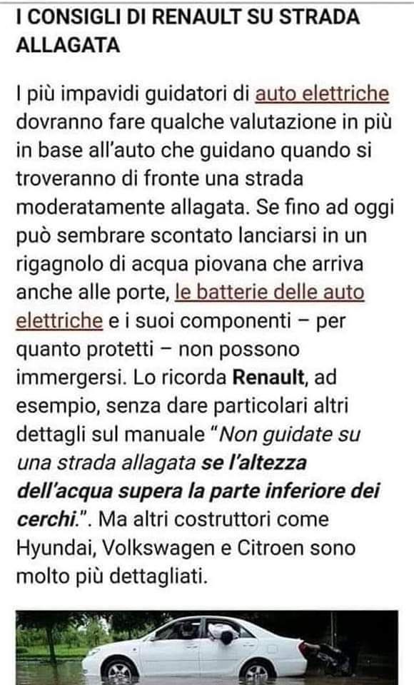 L’avvertenza è nei libretti d’istruzione delle Case automobilistiche. Pensate che gioia la prossima alluvione – la UE vieta la vendita di auto non elettriche dal 2025 – e che riuscita i trattori elettrici sulle zolle bagnate che la Casa Bianca sta già imponendo ai coltivatori. Non a caso molte compagnie di traghetti nel Nord Europa si rifiutano di caricare auto elettriche a bordo.