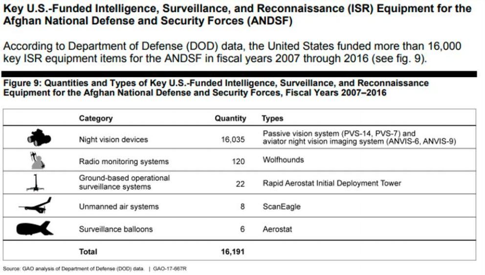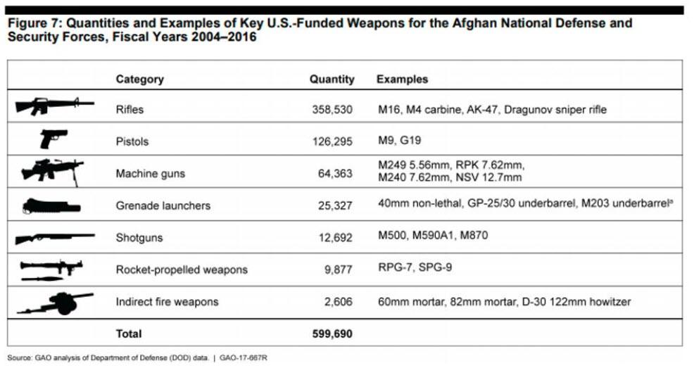 Dal 2003 gli Stati Uniti hanno fornito alle forze afgane almeno 600.000 armi di fanteria, inclusi fucili M16, 162.000 apparecchiature di comunicazione e 16.000 dispositivi per la visione notturna, secondo il rapporto del GAO .