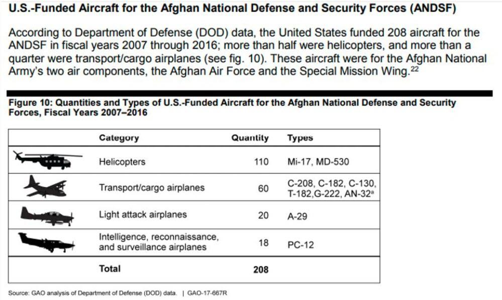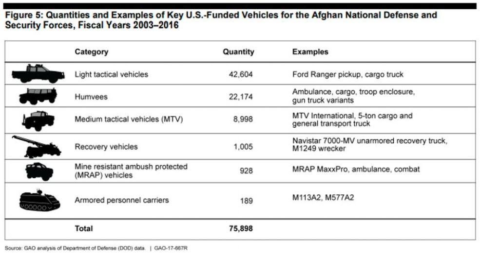 Tra il 2003 e il 2016, gli Stati Uniti acquistato e fornito 75,898 veicoli e 208 velivoli, alle forze armate e di sicurezza afgane, in base a un governo Accountability Office rapporto .
