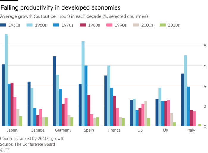 Quanto al calo della produttività, i media “europeisti” ci fanno credere che è un problema dell’Italia e degli italiani. Martin Wolf mostra invece che tutti i paesi sviluppati, dalla Germania al Giappone, dal Regno Unito Agli Usa, la produttività è calata: e in modo imponente dal 2010. Le delocalizzazioni, e lì immigrazione che diminuisce i salari reali (a fa scadere la qualità del lavoro) c’entrano, ma fino a un certo punto. E’ quasi stupefacente leggere sul Financial Times chi viene additato come colpevole. “La finanza ha un ruolo chiave. Il livello di sviluppo finanziario è buono solo fino a un certo punto, dopo di che diventa un freno alla crescita e che un settore finanziario in rapida crescita è dannoso per crescita aggregata della produttività ”.