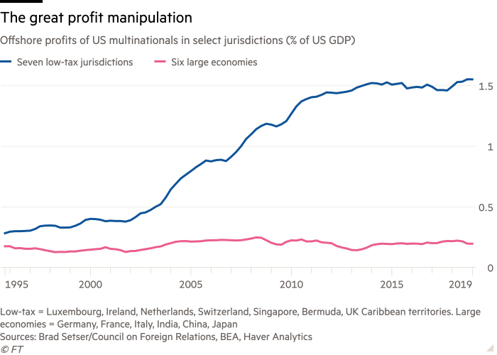 Sei multinazionali statunitensi dichiarano profitti sette volte maggiore nei piccoli paradisi fiscali (Bermuda, Caraibi britannici, Irlanda, Lussemburgo, Paesi Bassi, Singapore e Svizzera) rispetto a sei grandi economie (Cina, Francia, Germania , India, Italia e Giappone)