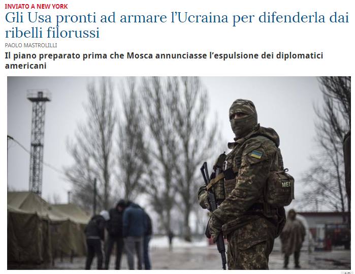 di fatto, pare preannunciare un false flag per far sedimentare nella mente delle gente questo concetto come un mantra: l’Ucraina è buona e amica dell’Occidente, mentre la Russia arma i ribelli cattivi. E la notizia, ancorché nell’aria da giorni, ora è confermata: il Pentagono sta preparando un piano per armare Kiev. L’iniziativa, confermata dal vice capo degli Stati maggiori riuniti, Paul Selva e appoggiata dal nuovo inviato nella regione, Kurt Volker, sarebbe inoltre precedente all’ espulsione di 755 diplomatici americani dalla Russia annunciata domenica da Vladimir Putin, come ritorsione alle nuove sanzioni contro Mosca decise dal Congresso e che Donald Trump si appresta a tramutare in legge.