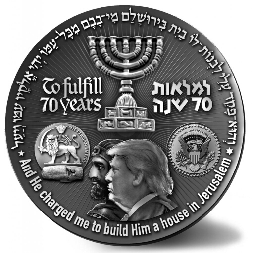 Le organizzazioni che hanno creato la moneta Trump-Cyrus originale stanno ora battendo un’edizione speciale “70 Year Redemption Coin” il cui scopo è generare uno sforzo internazionale per costruire il Terzo Tempio. I tempi, che arrivano poco prima del 70 ° compleanno di Israele, sono essenziali, e gli organizzatori vedono il Tempio come l’unica speranza per scongiurare lo sviluppo del conflitto multinazionale che incombe sul confine settentrionale di Israele.