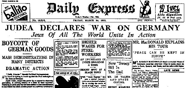 ‘Gli ebrei del mondo dichiarano ora la Guerra Santa contro la Germania. Siamo ora impegnati in un conflitto sacro contro i tedeschi. Li piegheremo con la fame. Useremo contro di essi il boicottaggio mondiale. Così li distruggeremo, perché la loro economia dipende dalle esportazioni’ (6).